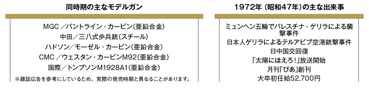 4月号の「MGC P-08カービン」で書いたように、1972年は第一次モデルガン法規制の翌年となるため、各社がその規制対象外の「長物(ながもの)」へと目を向けた時期だ。