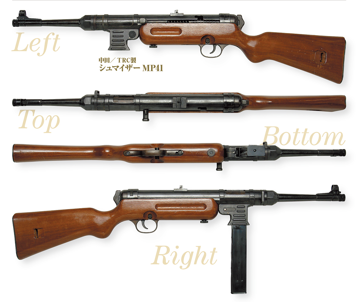 中田/ TRC のMP41では木製ストックのほかに、セミ/フルの切り替えができ、バレル下面に依託射撃用のバーがないことなどが特徴だったが、バレルナット部の形状がMP40のままだったり、分解方法もMP40と同じだったりと、急ごしらえと思える部分が多かった。それにも関わらず広告では細部まで作り込まれた試作のMP41の写真が使われ、差異があった。