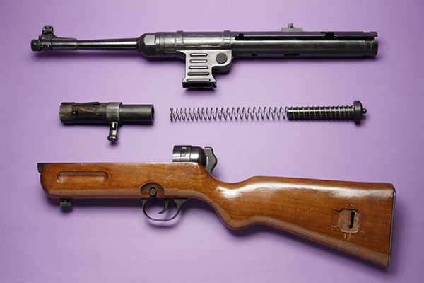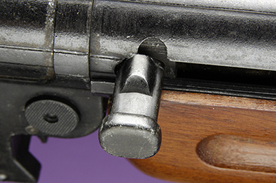 最後に、出荷前のテストで、銃口を下に向けてチャンバー内にエンジンオイルを満たし、火薬を入れていないカートリッジを1発だけマガジンに装填して空撃ちすると、加工・仕上げなどすべてがうまく行った製品は火薬でブローバックしたようにちゃんとカートリッジが排莢される。いわば世界初の油圧ブローバックで作動テストしていたわけだ。そして合格したものだけが出荷されていたという。