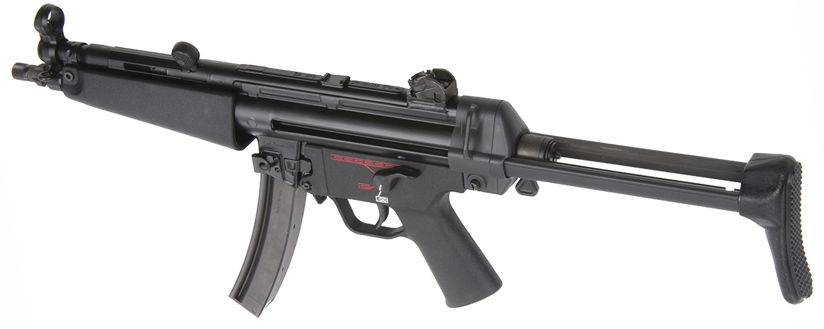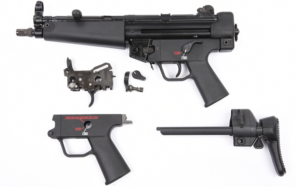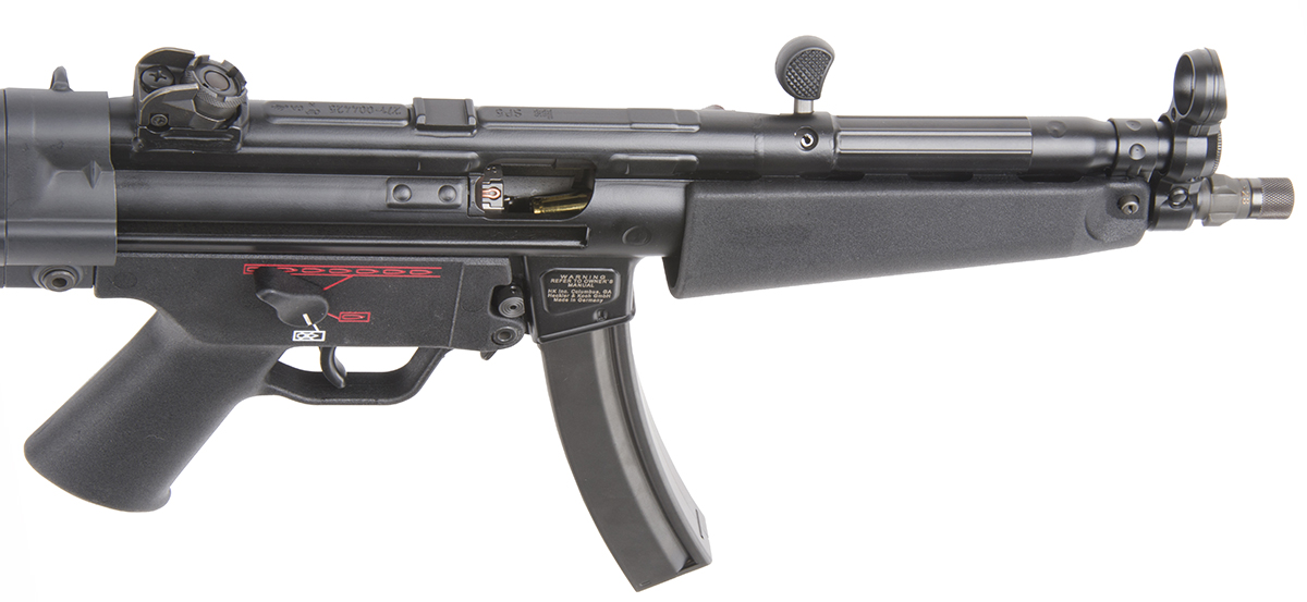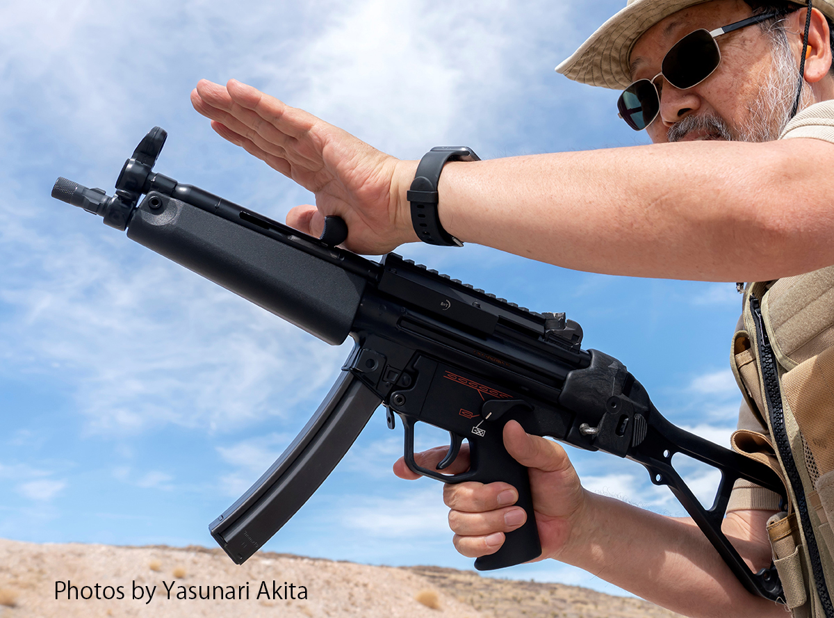 MP5については、本誌2020年11月号のAkita氏の記事であるH&K SP5ピストルに詳しく解説されているので、詳細はそちらをご覧いただきたい。同じSP5が今回も登場するが、内部にレジスタード・オートシアー(BATFE:Bureau of Alcohol, Tabaco, Firearms and Explosivesアルコール、タバコ、火器及び爆発物取締局にフルオート火器として登録されている装置)を組み込むことで、銃の法的なステータスはSMGになっている。そのため伸縮ストックを合法的に装着することが可能となり、スペック的には限りなくオリジナルのMP5 A5あるいはMP5 NAVYに近い状態にしている。