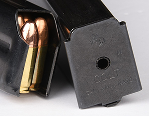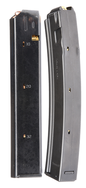 余談になるが、筆者の知るかぎり弾込めが最もやりやすいSMGのマガジンは、ローラー状のフォロワーを持つスターリングMkⅣの34連マガジンである。個人的な意見として、例えば弾込めが楽なスターリング マガジンを満点の10点とした場合、MP5が最初は9点で後半が8点、Colt製9mm用マガジンは最初が5点、10発目あたりから3点、20発目くらいからは1点という感じだ。前述のシングルフィードSTEN 32連マガジンに至っては、途中からマイナス10点以下というレベルで、素手ではとても太刀打ちできない。