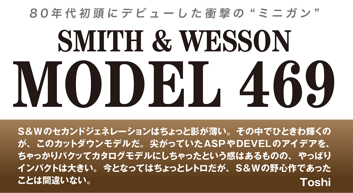 S&Wのファンとしては、459だけでもなかなかに興味深かったはずではあるが、本命はその後に控えていた。セカンドジェネレーションの一番の目玉は、今ご覧のモデル469をはじめとするファーストになかったカットダウンモデルだったことは疑う余地はあるまい(645等の大口径大型モデルのインパクトも大きかったですけどね)。