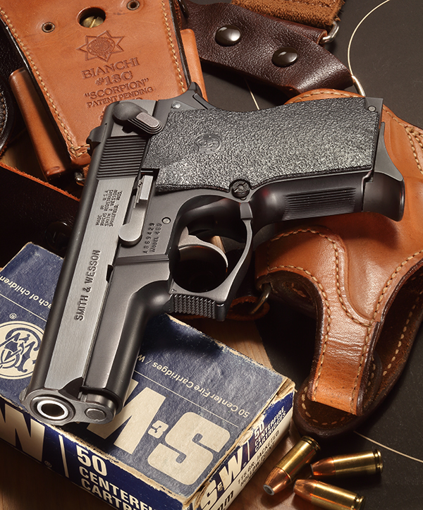 ダメだ。もう、どうにも離せなくなって、めでたくご購入。お値段は500ドル+税とやや高めだった。少し前なら、上手くすれば300ドル代の代物。中古市場において、この時期のS&W製DAオートはいまいち人気がなく、ひと頃はどこでも投げ売り状態だった。今は鉄砲不足で銃全体の相場が上がっており、この辺りが多分妥当な線。ちなみに発売当時の価格は、米ガンダイジェスト85年版で399ドル。フルサイズの459よりも40ドルほど安い価格設定だった。