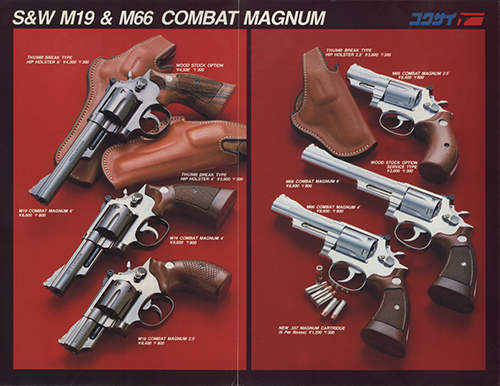 オプション:.357マグナムカートリッジ1箱6発入り¥1,200、スピードローダーM¥1,000、Kフレーム用サービスタイプラウンドグリップ(ウォールナットウレタン仕上げ)¥3,600、Kフレーム用オーバーサイズスクェアグリップ(ウォールナットウレタン仕上げ)¥4,500