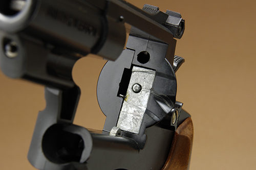 さらなる革新的改良の1つがカートリッジ。ベースは六人部登さんが開発したスプリング内蔵の可動カートリッジだが、岡田さんはこれをもっとリアルにしたかった。そこで、実弾のように真ちゅうの薄板をしぼってケースを作り、そこに弾丸相当のパーツを圧入し、雷管に相当する部分を貫通する軸にして、ここが可動して発火する新カートリッジを考案した。ケースにはクロームめっき、弾丸部には銅メッキという実にリアルなものだった。これは1980年に発売されたプラスチック製と金属製のパイソンから.357用として使われている。