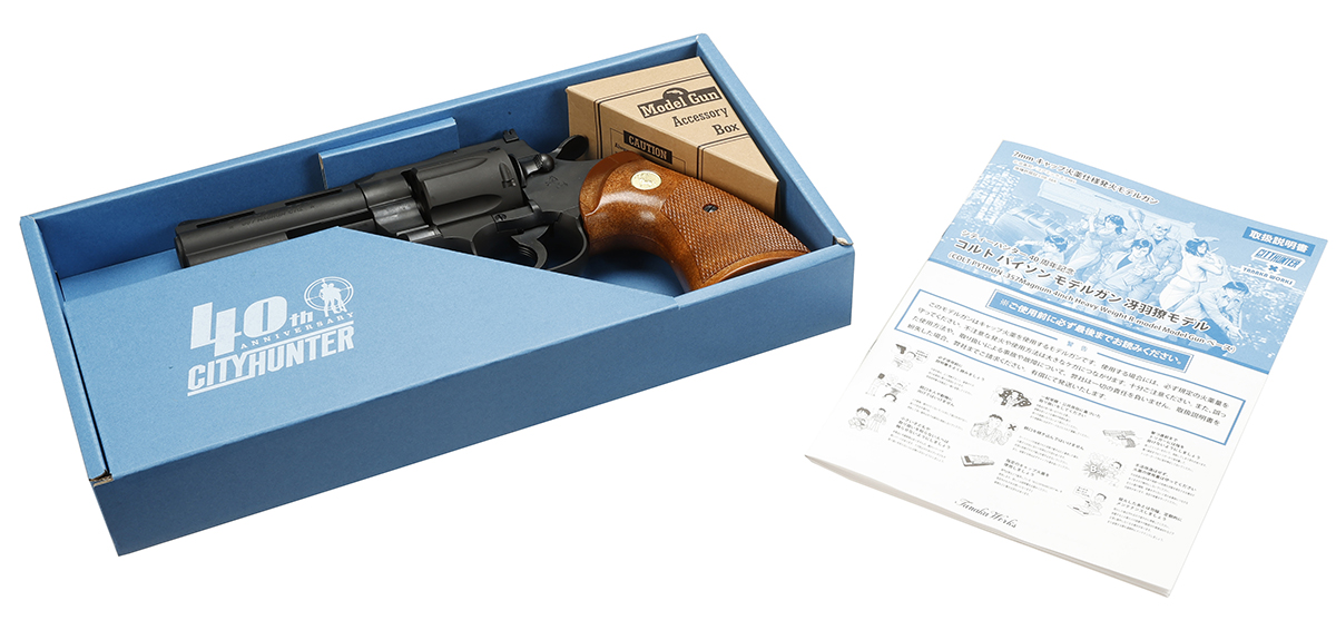 以前の製品は、大型パッケージ入りで原作に合わせてねじ込み式サイレンサー付きの豪華版であったが、今回はサイレンサー無しの普及版という位置付けだ。パッケージは、原作者北条司氏による40周年記念原画を使用した特別版となっている。付属するカートリッジは、原作で登場するものと同じメタルジャケットタイプが6発で、以前販売されたモデルガンと同じだ。