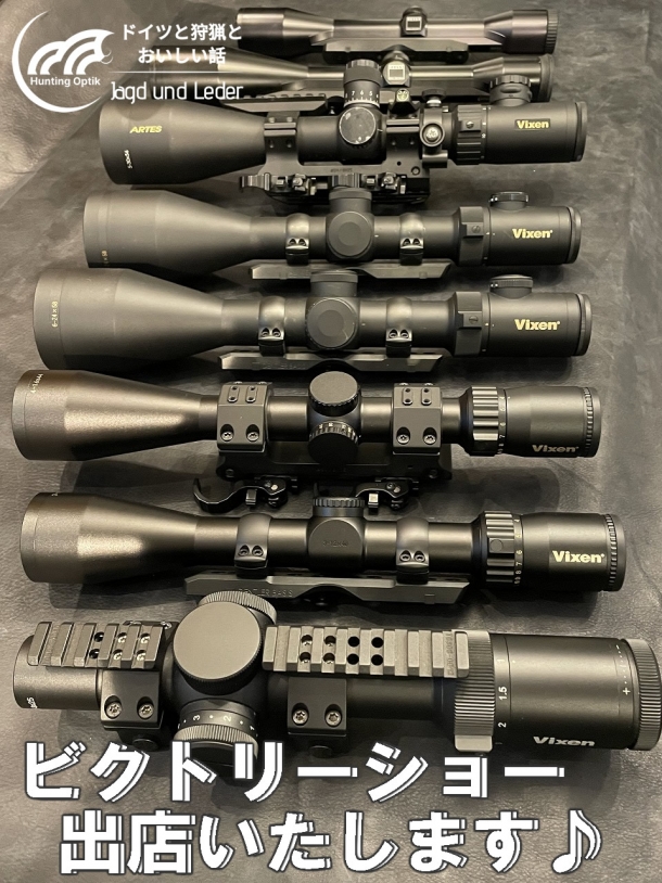 Vixenライフルスコープは全て実銃対応です。狩猟、射撃、サバゲーなど、Vixenライフルスコープはお取扱い店舗にて実際にお求めになる前に、ビクトリーショーは実機を実際に手に取ってスコープの見えをご覧いただける機会ですので、ドイツ製エラタック、デントラーマウント等のスコープマウントとあわせ、ぜひお試しください。