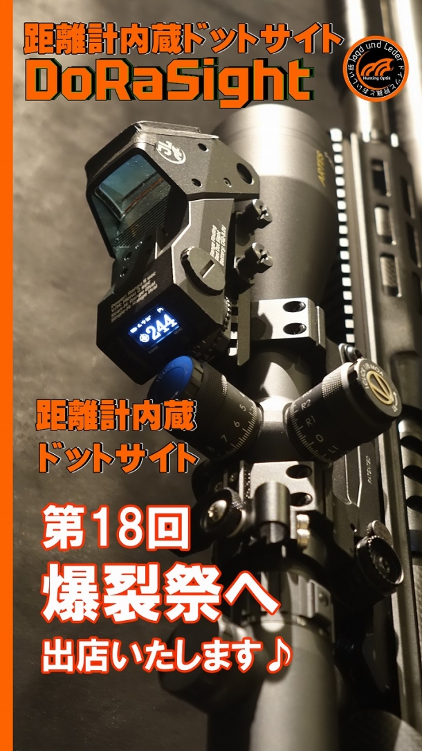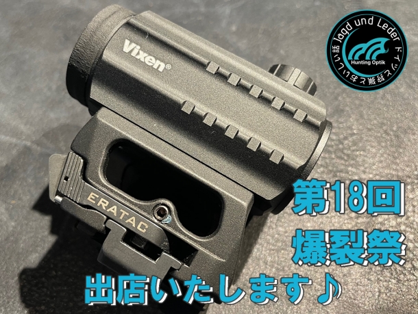 第18回爆裂祭では、ハンズオンにてDoRaSight、エラタック仕様のVixen 1x20ドットサイトをお試しいただけますので、お気軽にブースへ遊びにいらしてください♪狩猟用のスコープマウント、デントラーマウントのデモ機、ドイツ製軍用タクティカルマウント、エラタック傾斜マウントもご用意して皆さまのご来場をお待ちしております♪