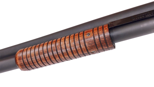 今回の特徴は、グリップ下部が丸みを帯びた初期型ストックと、マガジンチューブを銃身先端で固定する古典的構造の再現しているモデルです。