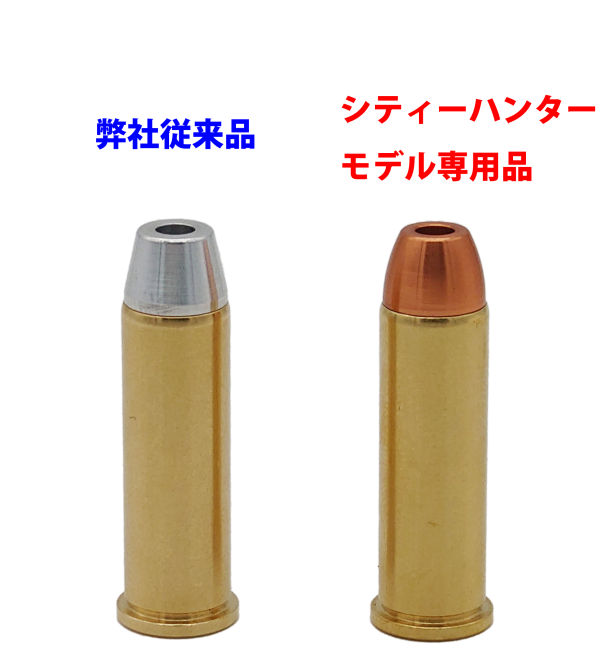 弊社標準の.357マグナムカートリッジはフラットノーズタイプのリード(鉛)弾を再現したものでしたが、『シティーハンター』で冴羽獠が多用する「フルメタルジャケット」弾(作中では「メタル・ジャケット弾」として登場)のタイプを専用品として再現して付属させています。