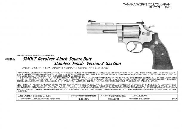 『SMOLT Revolver 4inch Square Butt Stainless Finish Ver.3  Gas Gun』
