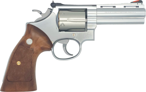 ニッケルフィニッシュ特有の輝きに、M27ならではのテーパーバレルやチェッカリングが合わさることで、特別注文でしか手に入らなかったレジスタード・マグナムの血脈を感じさせるハイエンドリボルバーらしい存在感を放っています。