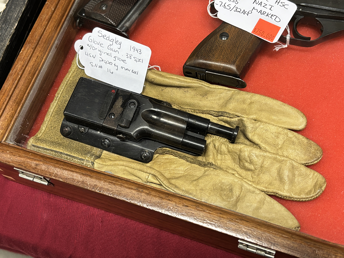 先ず一発目。何じゃこりゃという珍品を発見。グローブガンだ。Sedgley OSS .38 glove pistol (Sedgley Mk2)というもの。手袋に38SPL弾の発射装置を取り付けた仕込み銃だ。