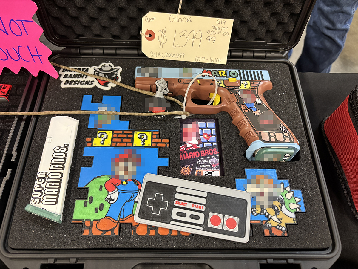さらにもう一挺、何じゃこりゃのピストルが待っていた。その名もG17“Mario”。グロック17にスーパーマリオブラザーズのカスタムペイントを施したもの。Dakota Bandit Designsという会社の製品。マアようやるわ。少し前に、グロック19の外観をレゴ風に飾った“Block19”というカスタム銃が物議を醸していたけど(ユタ州のCulper Precision社)、コレは大丈夫なのかね。版権とか任天堂が絶対下すわけないしね。100挺作ったうちの25番で、1,399ドル。自分は全然要りません。
