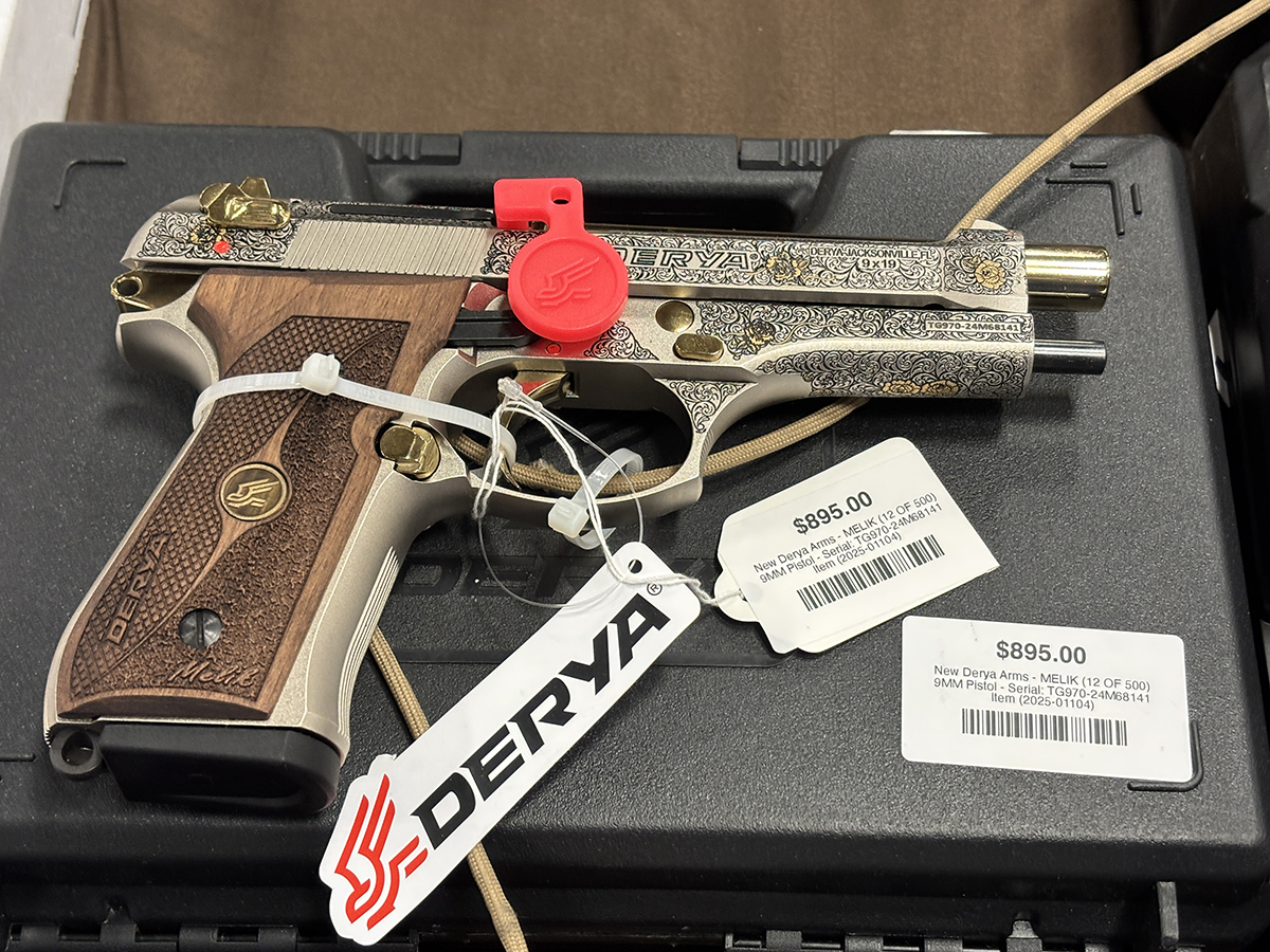 鉄砲へ戻って、再び何じゃこりゃなゲテ銃が出現。ギトギトに彫金を入れたサテンニッケルめっきのコピーベレッタだ。トーラスではなくて、トルコのDERYAというメーカーらしい。彫金はすべて手彫りで、操作レバー類は金メッキ。お値段895ドル。DERYAはグロックもどきのDY9とかこのベレッタもどきのMelikとか、長物ではAR15もどきとかイサカショットガンもどきとかウインチェスターM92もどきとかを作っている模様。こーゆーギトギト系は、自分は苦手です。