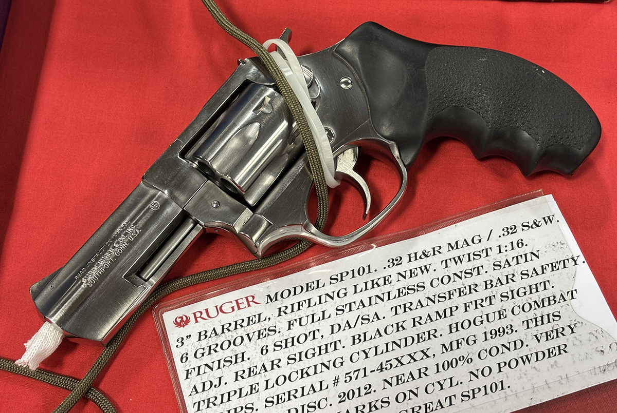 1挺めはちょい古のRUGER SP101だ。バレル長は3インチで、口径が32H&Rマグナム。リアサイトがフィックスドではなく、ブレードをフレームに埋め込んだアジャスタブルってところがニクイ。今では見掛けなくなったタイプだ。お値段は800ドルとチョイ高め。