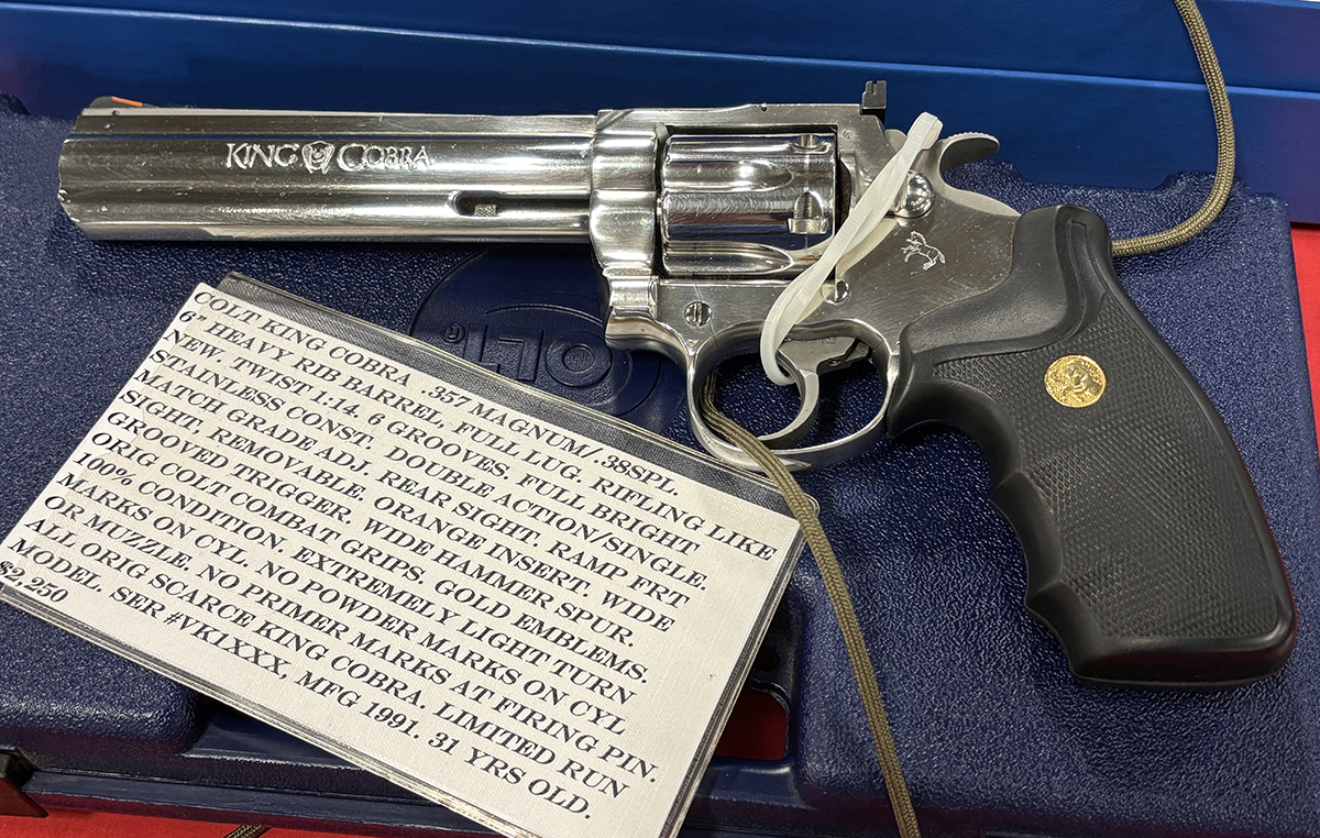 そしてもう1挺はコルトのキングコブラだ。91年製の6インチで、なんと2,250ドル。一応ハイポリッシュモデルではあるけど、ふざけたお値段。元値はせいぜい400ドルちょいの代物だからね(ベースモデルの場合)。何度も書くけど、キングコブラはJackさんが引退する時に譲ってもらう約束してたのに、彼が忘れて他の人に売っちゃったんだよね。痛恨の買い逃し。また思い出しちゃった。つらいです。