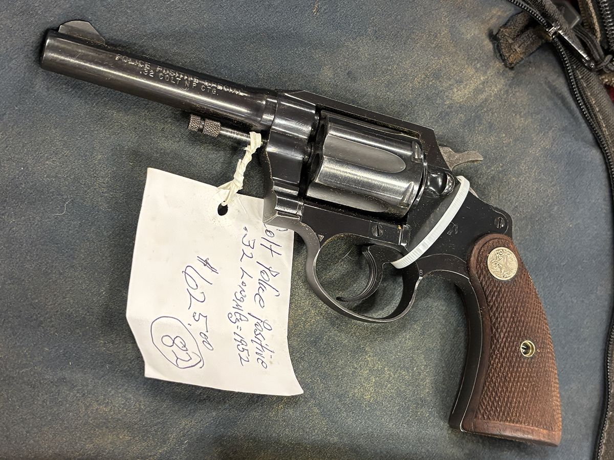 そしてポリスポジティブ。正確にはポリスポジティブスペシャル。モデルガンで見慣れた形。そこにあったのは32口径で1952年製だ。コレも全体に薄っすら錆びっぽい。今の湿気だと、ガレージの金庫に放置したらひと夏で錆び錆びだよ。お値段625ドルで交渉可。う~ん…パスだな。そのテーブルには他にも1967年製のコルトのオフィサーズモデルマッチなどもあって、650ドルと悪くないお値段。でも、同じく錆びっぽいんだよ。つくづく残念。