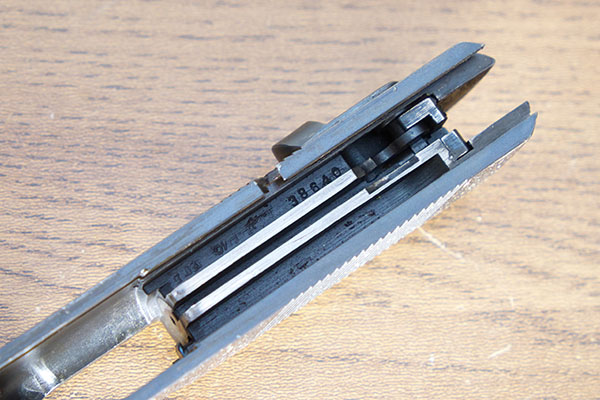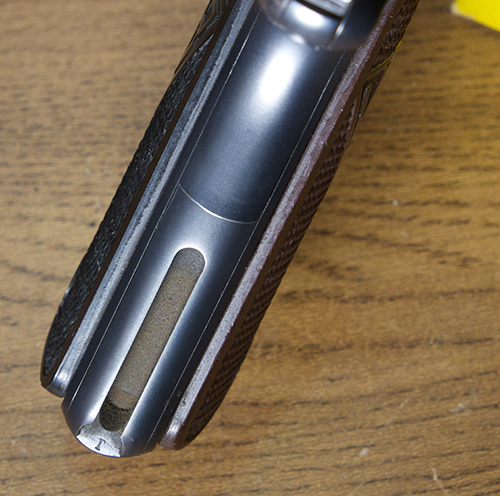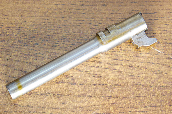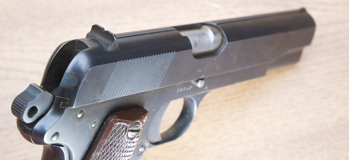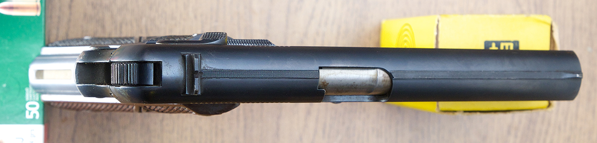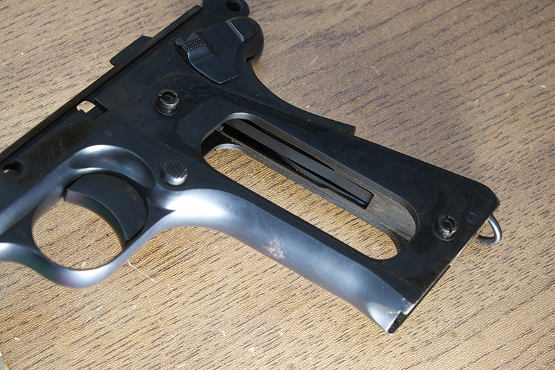 スライド内部を覗くと驚いたことにリコイルスプリングは二重でガイドに固定されている。現代銃のようだ。バレルには1911にあるようなリンクがない。フレームとかみ合わせてバレルをロックから解除するFNハイパワーと同様のデザインを取り入れている。