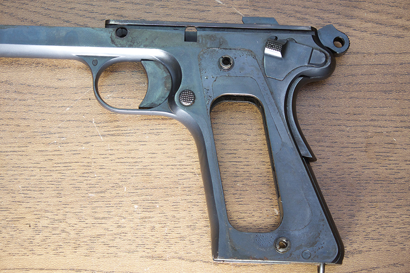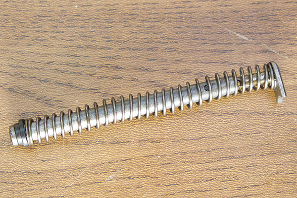 外見のチェックを終えて分解を試みる。1911と同じように分解できると思ったが、これが微妙に違う。分解にはスライドを途中まで後退させ、ノッチに合わせてスライドディスアッセンブリーレバーを押し上げ、スライドをロックする。この状態でスライド先端から飛び出ているロングリコイルスプリングガイドロッドを指で摘み、前に少し引っぱる。