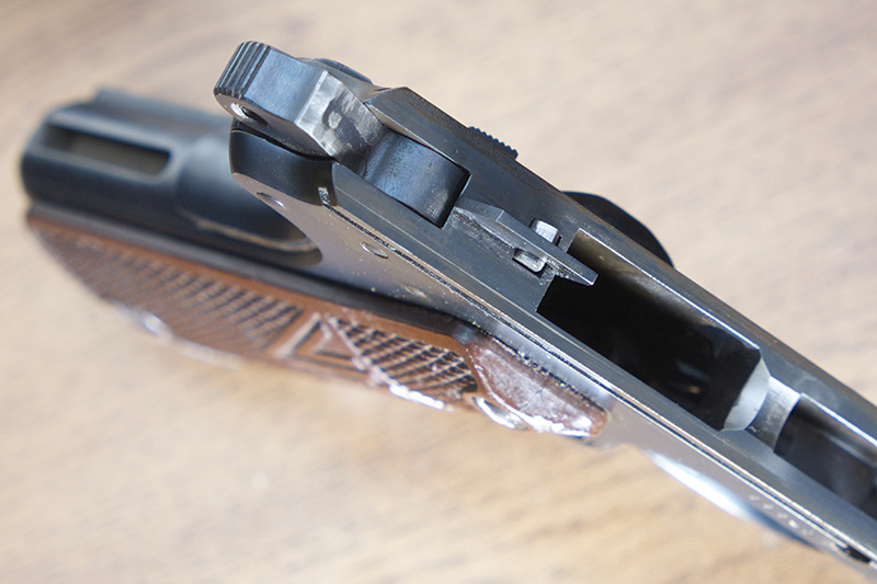 シングルアクションセミオートマチックピストルのチェンバーに弾を装填して携帯する方法は、コンディション1と呼ばれるコック&ロックか、ハンマーをダウンさせるコンディション2のいずれかとなる。このハンマーダウンを安全に行なうにはある程度、慣れが必要だ。ハンマーを指で押さえながら、トリガーを引いてゆっくり前進させることになるが、その指が滑ったりすれば、暴発してしまう。そこでラドムVIS wz.1935は、トリガーを引くことなく、安全にハンマーを前進させるためのデコッキングレバーを搭載した。これは1929年に登場したワルサーPPに初めて備わったものだ。その機能をチャッカリ拝借している。