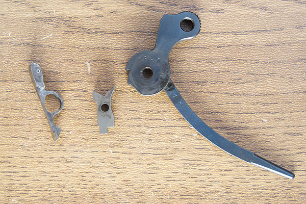 1911のマニュアルセイフティの位置にあるレバーは、セイフティではなく、分解時にいったんスライドを固定するためのディスアッセンブリーレバーだ。但し、当初の試作モデルでは、このレバーがマニュアルセイフティだった。しかし、デコッキングレバーを設けたことで、マニュアルセイフティは不要と判断され、その機能はなくなり、分解時のスライド固定ディスアッセンブリーレバーとなった。