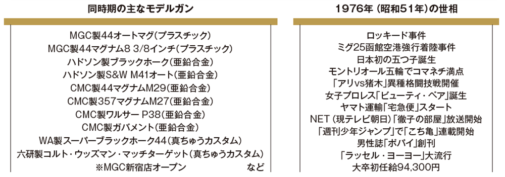 1976(昭和51)年は、とんでもなく長い8-3/8インチ・バレルの.44マグナムが衝撃的だった映画「タクシー・ドライバー」が公開され、元祖.44マグナムの「ダーティハリー3」も年末に公開されるなど、アメリカはもちろん、銃が持てない日本でもマグナムブームのまっただ中にあった。もちろん人気の劇画「ドーベルマン刑事」(1975~1979)も「週刊少年ジャンプ」に連載中だった。