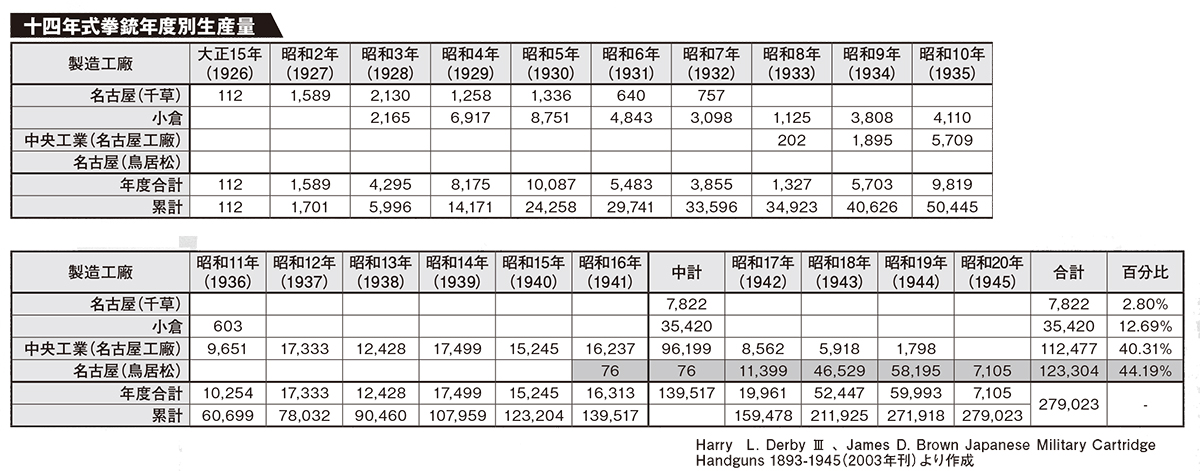 これを添付の表に当てはめて頂きたい、ご覧いただけばお判りのように、十四年式拳銃は、名古屋工廠千草製造所、小倉工廠、中央工業国分寺工場、名古屋工廠鳥居松製造所の4ヵ所で生産された。