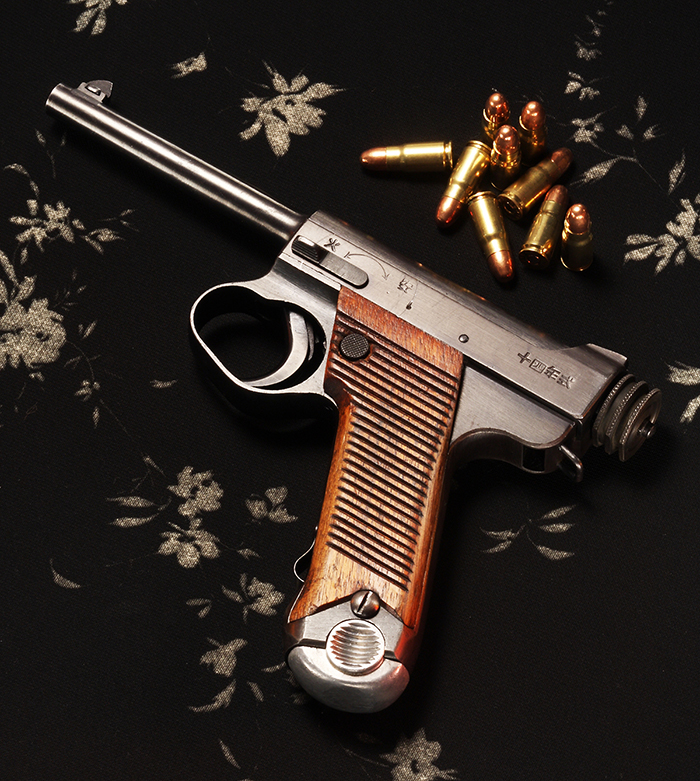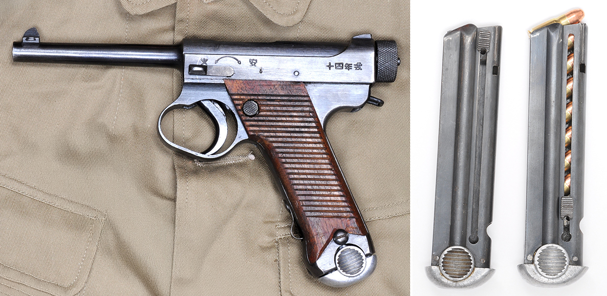 この十四年式は、きれいなブルーイングにグルーブの入ったコッキングピース、小型トリガーガード、マガジンキャッチ上部まで施されたグリップのすべり止めなど、典型的ないわゆる十四年式拳銃“前期型”の特徴を有する。