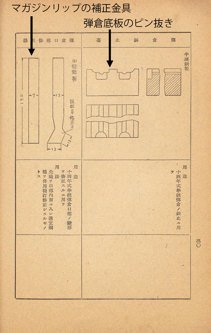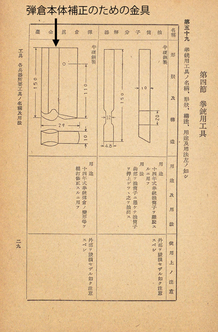 これは陸軍兵器学校の教科書だが、陸軍兵器学校は実施部隊の兵器係の下士官を養成する学校で、卒業生は中隊クラスの兵器係まで配属される。この教科書には、拳銃用工具として十四年式拳銃の調整用工具のみ4点が掲載されていてこの内3点が弾倉補正用の工具だ。ここから判断できるのは十四年式拳銃の弾倉は問題が多く、中隊兵器係の下士官が定期的に十四年式拳銃のマガジンリップや弾倉のガイド溝を調整していたという事になる。