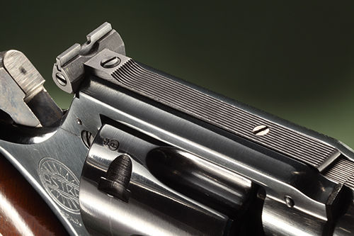 フレームはモデル19よりも大柄で厚め。トルーパー並みのボリュームがある。握った感じもバランスも、モデル19よりはトルーパーに近い。重量を比較すると、コイツが1,189gで、モデル19の6インチが1,106g、トルーパーが1,217gだ。シリンダーの太さは、コイツが40mmで、モデル19が36.9mm、トルーパーが39.4mmという数字。コイツが一番頼もしい。また、カウンターボアードやらバレルピンといった、レトロ派好みの装備も充実だ。