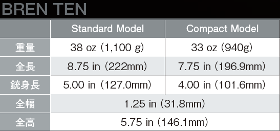 BREN TENのTENは、このピストルのために開発された10mmオート(10×25mm、10mm Automatic)口径を表している。この口径はジェフ・クーパー氏によって提唱され、当時コンバットシューティングには最適といわれた.45ACP口径よりも弾道学上優れ(より真っ直ぐな弾道や長い有効射程)、9×19mmよりもストッピングパワーの大きい新しいキャリバーとして生み出された。