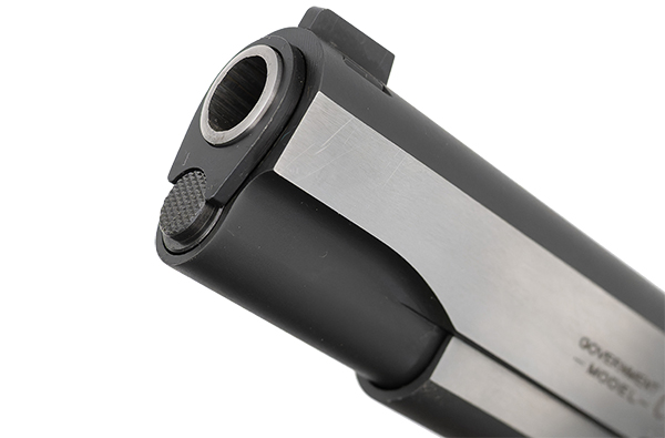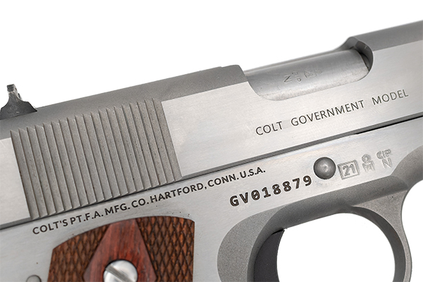 スライド左面には、チェコ輸入に伴うCIP刻印が確認できる。シリアルナンバーは“GV”プレフィックスを持ち、現行生産型のガバメントであることを示す。スライド後端の縦セレーションは、初期M1911から続くデザインを踏襲しており、操作性よりも伝統を重視したシンプルな形状だ。