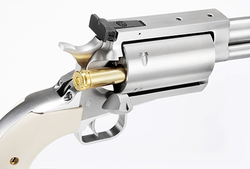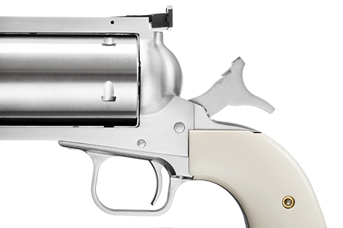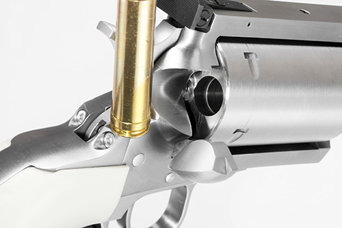 弾をグリップ内に収めるオートでは.50AEくらいが限界だが、リボルバーならシリンダーをより長く設定してもグリップサイズに変化はなく、前のめりに重くなるのも跳ね上がりを抑える面では有効だ。