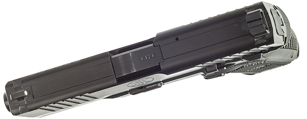 サイトは背の高いコンバットスタイルだが、緊急時に片手でスライドを引く際、何かに引っ掛けて引けるようにリアサイトのエッジが立っている。エキストラクターはローデッドチェンバーインジケータの機能を持っている。