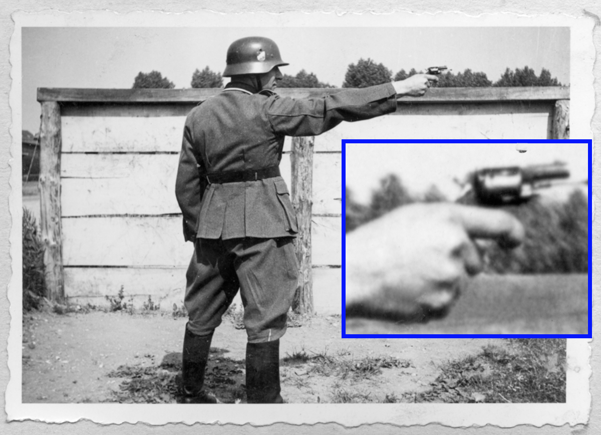 その写真は、おそらく非公式な彼の私物ピストルを構えるシーンだ。手にしている銃は、とても軍用ピストルには見えないベルギー製と思われるブルドックタイプのリボルバー。この兵士はこのリボルバーをどのような手段で入手したのかはわからない。しかし、この銃がドイツ製でなかったとしたら、これも広い意味では、“ドイツ軍と共に戦った外国製ピストル”ということになるだろう。このようなドイツ軍が使用した外国製ピストルのすべてを数え上げると、その種類は膨大なものになるに違いない。