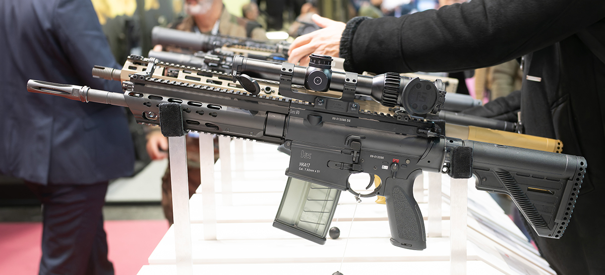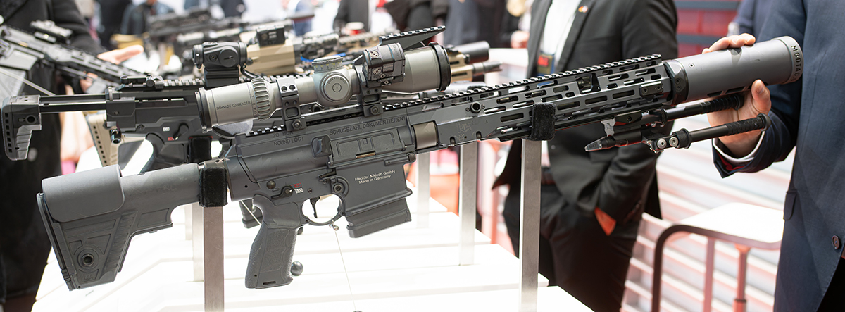 展示個体はサウンドサプレッサーに加え、Schmidt & Bender 5-20×50PMII ウルトラショートスコープとBT ATRASバイポッドを搭載し、DMRセミオート狙撃銃としての運用を意識したセットアップだ。信頼性の高いショートストロークガスピストンシステムを踏襲しつつ、軍用417との差別化として射撃精度を優先した、HK 製 7.62mm 精密セミオートライフルの最新形態と言える。