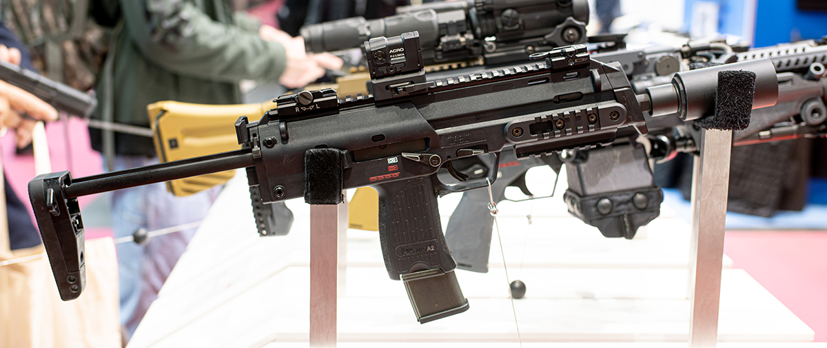 9 インチバレルのPDW 仕様は、市街地・車両・CQB での携行性を優先した最短モデルで、M-LOK ハンドガード、テレスコピックストック、アンビデクストラスコントロールを標準化し、展示個体は Aimpoint Duty RDSダットサイトを搭載している。HK416 より軽量かつコンパクトな“次世代 5.56mm PDW”として、欧州各国の特殊部隊向けに展開を図っているモデルだ。