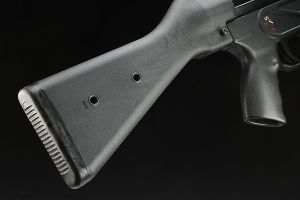 HK54はG3をほぼそのまま縮小、7.62×51mmを9×19mm仕様にしたものだ。ローラーディレイドブローバックメカニズムの作動原理はそのままだし、ロアレシーバーの構造もサイズが異なるだけで同じとなっている。フルパワーライフルカートリッジとピストルカートリッジで、そのガス圧は大幅に異なるため、ブリーチフェイスとローラー部の設計は変更されているが、作動原理は全く同じなので、その設計は比較的容易だっただろう。