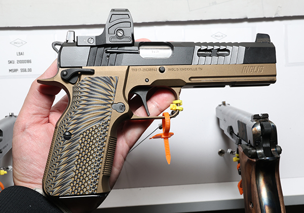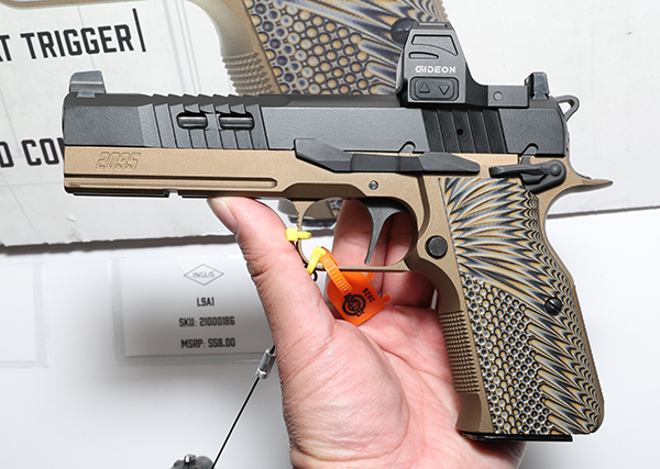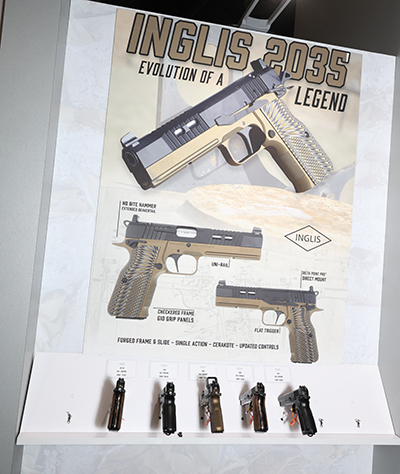 Tisas USA、Tokarev USA、Military Armament Corp、Spandau Arms、そしてInglisを含む複数のブランド製品を取り扱うSDAアームズのブースではブラウニングハイパワーのデザインを独自にモダン化させたInglis 2035を紹介。これまでもGirsanなどトルコのクローンメーカーが独自に近代化させたハイパワーを紹介してきたが2011系のようにさらに突き進んだアップデートとなっている。2011系リミテッドガンのようなフルサイズダストカバーと長いアクセサリー、アグレッシブなフロントセレーションに軽量カットを加えたスライドにはDPPフットプリントのオプティックカットとサプレッサーハイトサイトを備える。約1.8㎏のフラットフェイストリガー、エクステンデッドアンビセイフティ、グリップ形状もやや大型化しつつフロントストラップとバックストラップにチェッカリングが備わっており、グリップの安定感は抜群だ。メーカー希望小売価格は$731とのことだ。クラシックなハイパワーの系譜を大胆に再解釈したモダンモデルとして、とても面白いと感じる。