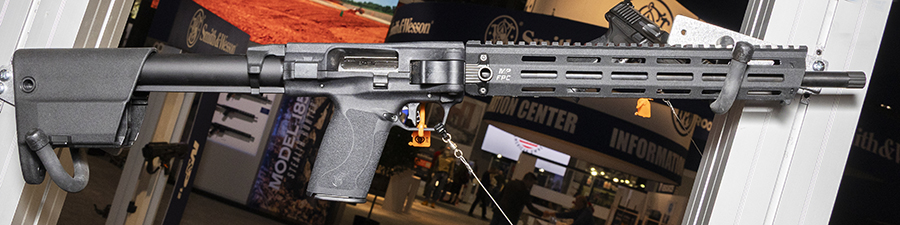 本体中央のヒンジを軸に折り畳める16.26インチバレルのカービン、M&P FPCシリーズはM&P用マガジンを使用するPCCとして設計されたが、今回はその口径に5.7mm×28が加わった。展開時の全長は772mm、折りたたみ時は416mmとなる。22連マガジン3本が付属する。メーカー希望小売価格は$719。