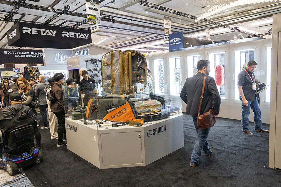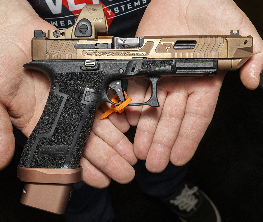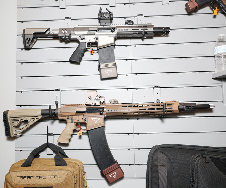 高品質ガンケースメーカーとして知られるSavior Equipmentとの協力関係を背景にTTIカスタムガンを印象的にアピールする展示だ。こちらは『ジョン・ウィック:コンセクエンス』(John Wick: Chapter 4)でドラゴンブレス弾と共に強い印象を残したショットガン、TTI JW4 Dracarys Gen-12のバリエーション。ブロンズ/FDEセラコート仕上げとPDWストック付きモデルだ。