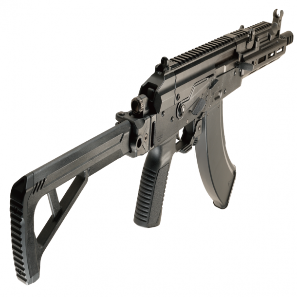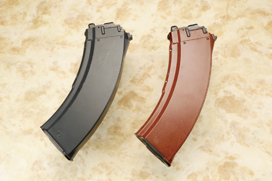 AKXはガスブローバックガンAKMをベースにモダナイズしたカスタム。オリジナルデザインながら実銃に存在しても違和感のない洗練されたスタイリッシュなフォルムを有している。ダイキャスト製レシーバーは実銃のAKMを意識したザラザラとした質感が再現され、おもちゃっぽさをいっさい感じさせない、ストック基部はイマドキな20mmレール仕様で、装着されるストックはミニマリストタイプが採用されている。