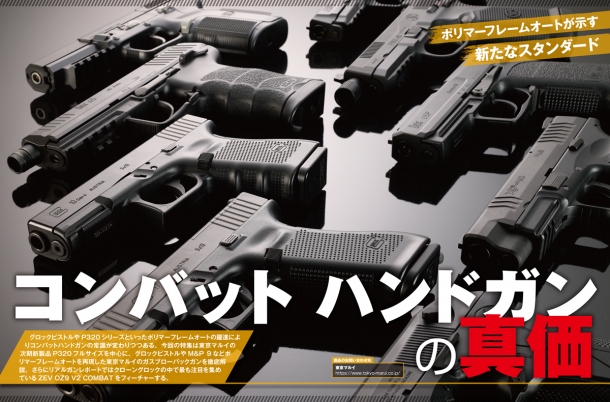 グロックピストルやP320 シリーズといったポリマーフレームオートの躍進によりコンバットハンドガンの常識が変わりつつある。今回の特集は東京マルイの次期新製品P320 フルサイズを中心に、グロックピストルやM&P 9 などポリマーフレームオートを再現した東京マルイのガスブローバックガンを徹底解説。さらにリアルガンレポートではクローングロックの中で最も注目を集めているZEV OZ9 V2 COMBAT をフィーチャーする。