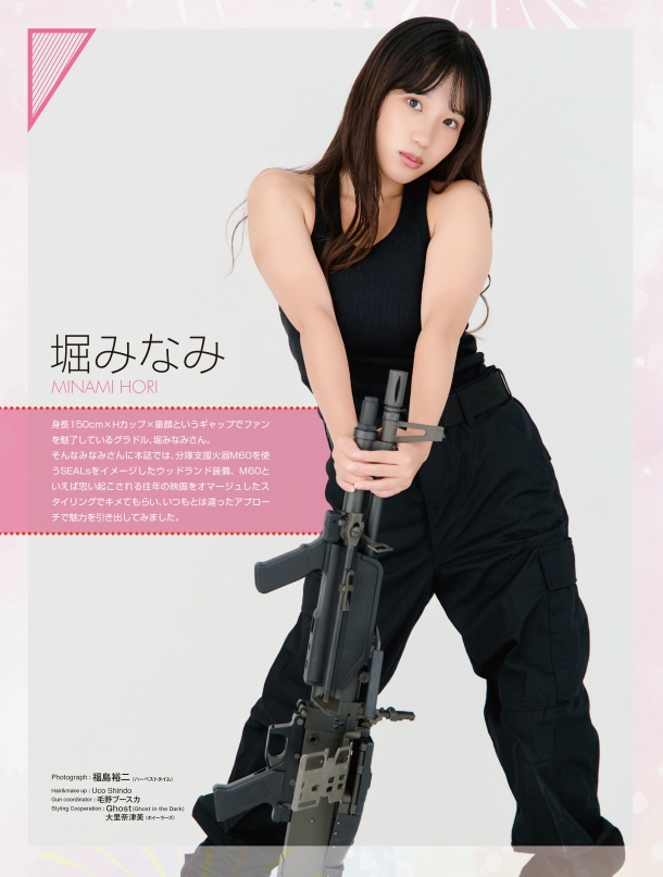 そんなみなみさんに本誌では、分隊支援火器M60を使うSEALsをイメージしたウッドランド装備、M60といえば思い起こされる往年の映画をオマージュしたスタイリングでキメてもらい、いつもとは違ったアプローチで魅力を引き出してみました。