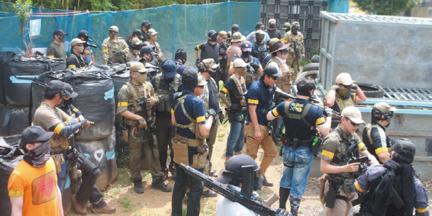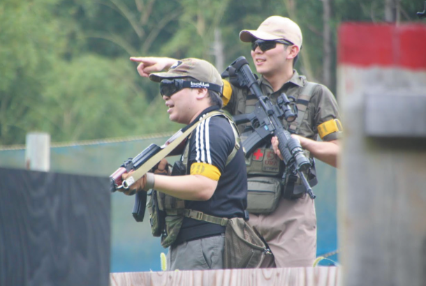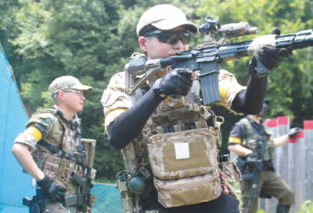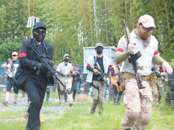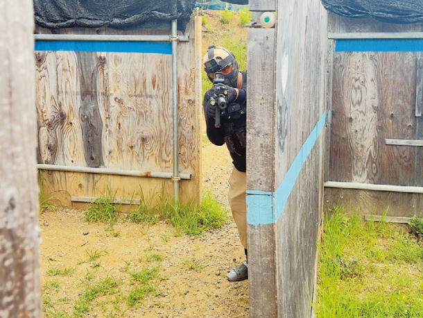 メインウェポンがスガ切れを起し、セカンこダリーウェポンへ切り替えて交戦している参加者。通常のサバゲとは異なり、各マガジンのガスの残量へも気を配る必要がある