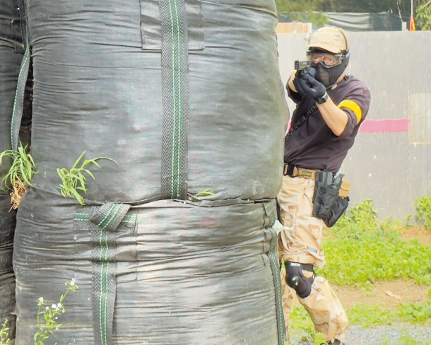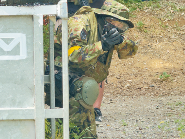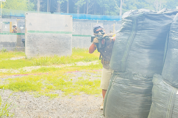自衛隊迷彩に身を包んだ参加者はハンドガンで応戦! 通常であれば電動ガン相手に不利を取ってしまうが、ガスブロオンリーなイベントであったため、ハンドガンだけでも充分に楽しむことができた