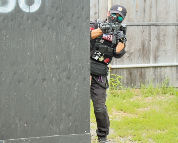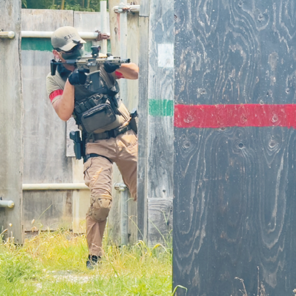薄い構えで正面の敵と交戦中の参加者。ダブルタップで見事ヒットを取り大活躍していた。リアカンのため、複数のマガジンを携行するために猛暑の中でもプレートキャリアを着用している