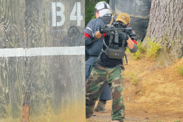 20mほど先にいる敵と交戦中の参加者。電動ガンと比較するとグルーピング性能が若干落ちるため、必然的に通常のサバゲより5mほど交戦距離が短かった
