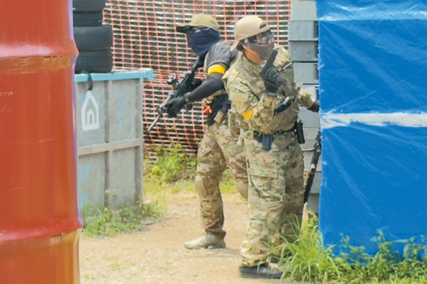 味方同士サポートしあって敵と交戦している模様。いつもの電動ガンと異なる弾道に少々手を焼いているようだ